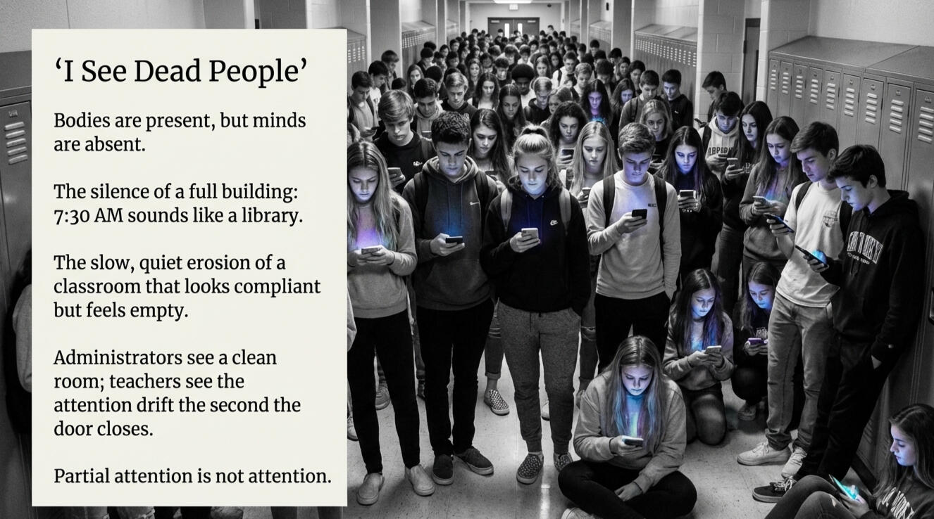 Chapter 2“I See Dead People”The Phone in the RoomHow to Read This ChapterThis book follows a framework. If you have read the introduction or any previous chapter, you have already seen it. If you picked up this chapter on its own, here it is.The problems facing in-person education today are big. They are connected. And they will not be solved by one person acting alone. Every large, meaningful problem follows the same path to a solution.Identify the problem. Some problems are easy to see. The hardest ones hide underneath the obvious, feeding every visible issue while staying out of sight.Frame it so others can see it too. A problem you understand but cannot explain to others is a problem you will solve alone. And you cannot solve this one alone. You are going to need a bigger boat.Build a plan with clear first steps. You will never have the complete plan before you start. If you wait for that, you will stall. Get the first steps right and adjust as you learn.Execute and iterate. If something is not getting you closer to the goal, change it. Above all, keep pushing forward. This is the hardest part. My dad always said that if you bite off more than you can chew, you only have two choices: start chewing or spit it out. Quitting has never solved a real problem.• • •This chapter applies that framework to the most visible, most immediate, and most solvable problem in American schools today: the smartphone.The problem is not hard to identify. Every teacher in the country can describe it. The challenge is framing it clearly enough that parents, administrators, and school boards see it the way teachers do. Because right now, most people outside the classroom do not understand what is actually happening inside it.Or outside it. Or in the hallways. Or in the lunchroom. Or in the thirty minutes before the first bell rings.So let me show you.• • •The Parent Walk-ThroughImagine you are a parent. Your child’s school invites you to spend a morning. Not for a meeting. Not for a conference. Just to see what a normal day looks like. You arrive when the doors open at 7:30.The first thing you notice is the silence.Not the silence of an empty building. The building is full. Students are everywhere. They are sitting in the commons, leaning against walls, gathered in clusters near their lockers. But almost no one is talking. Almost every head is down. Almost every pair of eyes is locked on a screen.Thirty minutes before school starts, in a building full of teenagers, and the room sounds like a library. Not because anyone told them to be quiet. Because the phones have them.You watch for a few minutes. Two friends are sitting next to each other on a bench, each scrolling separately. A group of four students stands in a loose circle, but no one is looking up. One of them laughs at something on their screen. Nobody else reacts. They are physically together and completely alone.I see this every morning. I work the door. I welcome every student who walks in. I make eye contact, say good morning, and try to get a response. It is something I have done my entire career, long before I became a teacher. When I ran casinos, I trained every employee on what we called the three-foot rule. If anyone comes within three feet of you, you look up, you make eye contact, and you acknowledge them. It was not optional. It was how we built a culture of connection in a building full of strangers.I still use that rule today. Every morning at the door. Every pass through the hallway. Every time I see a student. Look up. Make eye contact. Say something. It is one of the simplest things an adult can model for a young person, and one of the most important.But at 7:55, when I need students to put their phones away and get to class, I am fighting for their attention against a device that has held it for the last twenty-five minutes. They do not want to let go. Some of them barely look up. Getting them out of that trance and into a classroom ready to learn is like pulling someone out of a current. It takes effort every single morning.Now imagine you follow one of those students to class. You take a seat in the back of the room and watch.The teacher is halfway through a lesson. It took real planning to build. The board is covered in steps. A few students are following along. A few are catching up. The room has a rhythm to it.Then something happens. It is so small you almost miss it. One student shifts in their chair and glances down. The phone stays under the desk. A quick check. Maybe a second. Across the room, another student sees the movement. Their eyes leave the board too. A few seconds later the teacher asks a question. Silence. The teacher rewinds and starts again.Five minutes later it happens again. Another vibration. Another glance. Another student disappears into a screen just long enough to lose the thread of the lesson.From the back of the room, you would not see anything dramatic. No disruption. No loud talking. No open defiance. Just a room that slowly empties out while every seat stays full.At lunch, you see the same thing. The cafeteria is full of students eating with their heads down. Some tables have ten kids sitting together, and half of them are on their phones. The conversations that do happen are short, interrupted, half-present. The lunchroom should be the loudest, most social thirty minutes of the day. Instead, it feels like a waiting room.In the hallways between classes, students walk with their phones in front of them. They do not look where they are going. They bump into each other. They walk past teachers without making eye contact. They are zombies moving between rooms, transfixed on a screen for the three minutes of freedom the passing period gives them.That is a full day at a school with self-carried phones.The students are there. You can see them. They are sitting in their chairs, walking through the halls, eating in the cafeteria. But their attention has left the building. Their minds are some