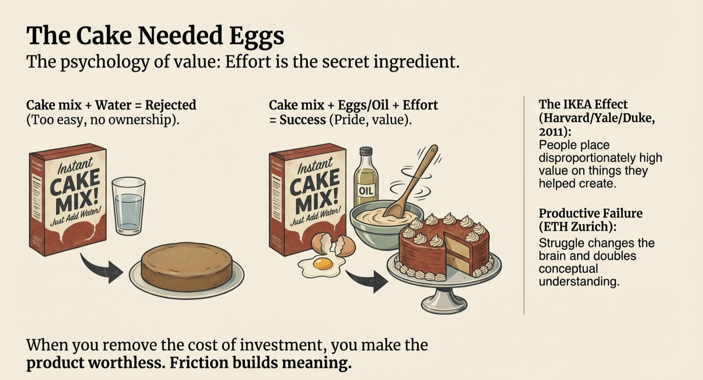 This Is Not Just a Story. It Is Science.What Ernest Dichter discovered through interviews in the 1950s, researchers have since confirmed and expanded in controlled studies. The connection between effort and value is not a feel-good idea. It is one of the most well-documented patterns in behavioral science.In 2011, a research team from Harvard, Yale, and Duke published a landmark study that gave this phenomenon a name: the IKEA effect. The finding was straightforward. People place a disproportionately high value on things they helped create, even when the things they created are objectively worse than a professionally made version. In one experiment, participants who assembled simple furniture were willing to pay 63% more for what they built than people who were shown identical pre-assembled versions. Same furniture. Same materials. The only difference was effort. And that effort changed how people valued the result.The researchers pushed further with an origami experiment. They asked one group to fold paper cranes and frogs, and a second group to simply look at the finished products. The results were striking. The people who folded their own paper cranes valued their clumsy, crooked creations at nearly five times the rate of the people who just looked at them. The builders even rated their amateur work almost as highly as expert-made origami. The labor itself had fundamentally changed perception. Not the quality of the output. The effort of the input.But the most important finding for education came from a different part of the study. The researchers discovered that the effect only held when the work led to successful completion. When participants built something and then watched it get taken apart, or when they could not finish what they started, the extra value disappeared entirely. Effort alone was not enough. The effort had to lead to something the person could look at and say: I did that. I finished it. It is mine.Think about what that means for a school. A student who shows up every day, does the reading, works through the math, writes and rewrites the paper, and walks across the stage at graduation has cracked every egg in the recipe. That diploma means something to that student because it cost something. Not just tuition or time. Real personal investment.A student who missed large stretches of the year, completed an online credit recovery module from a couch, and walked across the same stage did not make that investment. The diploma looks the same. The ceremony is the same. But the experience behind it is completely different. One student built the cake. The other added water.As a parent, ask yourself: which version do you want for your child? The one that looks right? Or the one that actually is right?Struggle Is Where Learning LivesThe IKEA effect explains why we value what we build. But there is a deeper question for anyone who cares about education: does struggle itself produce better learning? Not just more pride in the result, but a genuinely deeper understanding of the material?The answer, backed by two decades of research across thousands of students, is yes.Manu Kapur, a learning scientist at ETH Zurich in Switzerland, has spent his career studying what he calls productive failure. His approach flips traditional instruction on its head. Instead of teaching a concept first and then asking students to practice, he gives students a problem they do not yet know how to solve and lets them struggle with it before any teaching happens. The students fail. They generate wrong answers. They hit dead ends. They get frustrated. And then, when the instruction comes, they learn the material at a significantly deeper level than students who were taught the conventional way.This is not a minor difference. Kapur's meta-analysis across 53 studies and more than 12,000 students found that this approach produced effects on conceptual understanding and knowledge transfer nearly twice as large as what a student typically gains from a full year with a good teacher. The students who struggled first did not just score higher on a test. They understood the ideas more deeply and could apply them to problems they had never seen before. The struggle was not an obstacle to their learning. It was the mechanism that made the learning stick.Other researchers have confirmed this from different angles. Albert Bandura's foundational work on self-efficacy found that successful completion of difficult tasks is the single most powerful builder of lasting confidence. Not praise. Not encouragement. Not lowered expectations. Actually doing something hard and finishing it. Jo Boaler at Stanford has demonstrated that when students engage in productive struggle in mathematics, measurable changes occur in their brains. The neural pathways associated with problem-solving and conceptual thinking grow stronger. The struggle changes the brain itself.Here is the part that matters most for parents. This research consistently shows that struggle has to be real. It cannot be performed. It cannot be simulated. It cannot be outsourced to a machine. The student has to be the one doing the hard thing. When we hand a student a shortcut that removes the difficulty, we are not helping them. We are taking away the very experience that would have made them stronger, smarter, and more capable.Every parent has watched their child struggle with something hard. Homework that did not make sense. A test they were not ready for. A project that felt overwhelming. The instinct to step in and remove the difficulty is natural. It comes from love. But the research is clear: the difficulty is doing the work. Not the kind of difficulty that overwhelms and defeats a student. The kind that challenges them just beyond what they can do easily, with a teacher in the room who supports them without rescuing them. That is the space where learning actually happens.Three Problems, One OutcomeSchools across the country are dealing with three problems that do
