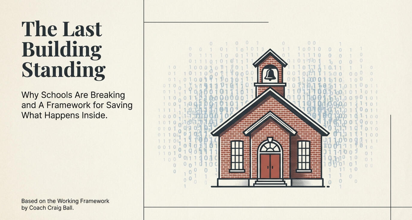 THE LAST BUILDING STANDINGSchools Won’t Disappear. They’ll Just Stop Working.A Framework for Saving What Happens Inside.This Book is for teachers, parents, administrators and school boards ready to frame the problem, start the conversation, and push for real change in schools across America.A Working Framework by Coach Craig Ball