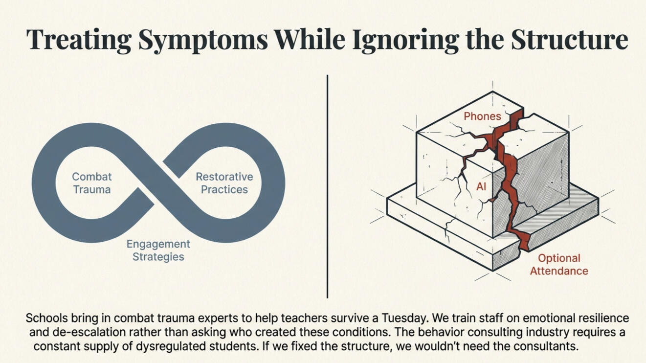 A COACH’S NOTEThe Business of Behavior: Before We Hire Another ConsultantBefore I became a teacher, I spent more than two decades in the business world. I ran companies. I managed people. I operated in one of the most heavily regulated industries in the country. And one of the things that experience taught me, the kind of lesson you cannot unlearn, is how to tell the difference between someone who is solving a problem and someone whose livelihood depends on the problem never being solved.I also learned something else. When things go wrong in an organization, the people at the top almost never blame themselves. They blame the people closest to the problem. In business, it is the frontline employees. In medicine, it is the nurses. In education, it is the teachers.I bring both of those lessons up because I want to be honest about something before this book begins.There is an industry built around the problems in American schools. It is large. It is profitable. And it is growing, because the problems are growing. Consultants, trainers, curriculum specialists, behavioral intervention companies, social-emotional learning platforms, trauma-informed practice certifications. The market for helping schools manage dysfunction is booming. And almost none of it is designed to fix what is actually broken.I have watched this from both sides now. As a businessman, I recognize the model. As a teacher, I live inside it.Three times a year, our school brings in consultants. They are part of a coordinated training effort, a triad of professionals who each address a different piece of what everyone agrees is a growing crisis. The first works with teachers on emotional resilience. The second teaches trauma-informed practices for managing student behavior. The third coaches classroom engagement strategies.All three are credentialed. All three are professional. All three care about the work. I am not questioning their character.I am questioning the model.The first consultant specializes in helping teachers stay emotionally intact. She comes from a military background, working with soldiers returning from combat zones, and she applies that same framework to our teaching staff. Let that settle for a moment. We are using techniques developed for men and women who survived armed conflict in foreign countries to help teachers get through a Tuesday in an American high school.On one level, there is something validating about that comparison. The emotional toll on teachers right now is real and it is severe. Teachers are not just tired. They are depleted. They are absorbing behaviors, hostility, and chaos that would have been unthinkable a generation ago, and they are doing it with fewer resources, less authority, and more scrutiny than at any point in the profession’s history.But step back and ask a harder question: why are we treating our classrooms like war zones? What is happening inside the building that has made the emotional experience of teaching so damaging that we need someone trained in combat trauma to help our staff survive it? And more importantly, who made the decisions that created these conditions?It was not the teachers.The teachers did not decide to let students carry phones all day. The teachers did not design online credit recovery systems that allow students to earn diplomas without showing up. The teachers did not adopt AI policies that are unclear, unenforceable, or nonexistent. The teachers did not lower attendance standards. The teachers did not choose to prioritize graduation rates over actual learning.Those were structural decisions. They were made by administrators, school boards, district offices, and state legislatures. They were made by people with titles and authority and the power to set policy. And when those decisions created exactly the dysfunction anyone with common sense could have predicted, those same people did not look in the mirror. They looked at the teachers.This is the part that should make your blood boil if you are a teacher reading this.The board sets the policy. The superintendent implements it. The principal enforces it. And when the policy produces chaos, the training budget is spent on teaching you how to cope with the chaos. Not on fixing the policy. On fixing you. As if you are the problem.Every training day carries the same unspoken message: if you were better at de-escalation, the behaviors would improve. If you were more resilient, the burnout would decrease. If you were more engaging, the students would pay attention. The finger always points downhill. It points at the people with the least power and the most exposure.Teachers are the only professionals in America who are expected to manage the consequences of decisions they had no part in making, absorb the blame when those consequences materialize, and then sit through a training on how to do it better next time.A nurse does not get blamed for hospital infections caused by administrators who cut the cleaning budget. A soldier does not get blamed for a war started by politicians. But a teacher gets blamed every day for behaviors created by a system that has removed every structural support that made classrooms functional.That is not accountability. That is deflection. And it has been going on long enough that most people in education have stopped even noticing it.The first consultant helps teachers survive this dynamic. She does it well. But coping is not solving. Coping is what you do when the conditions do not change. And the conditions are not changing because the people with the power to change them keep hiring consultants instead.The second consultant is the one who concerns me most. He teaches restorative practices. Trauma-informed instruction. De-escalation. How to reach students who have shut down, act out, or refuse to engage. On the surface, this sounds compassionate. It sounds like exactly what schools need. And that is what makes it so effective as a business model.Below the surface, his entire
