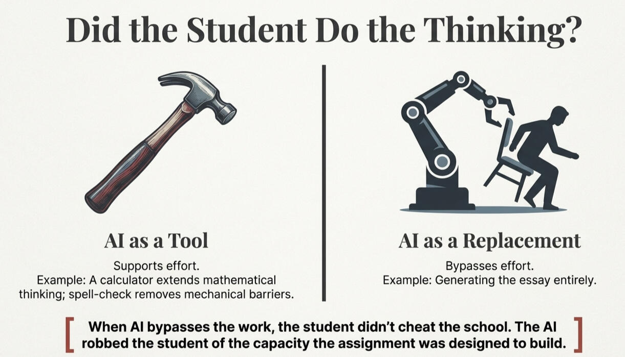 • • •What Gets Lost, and What They Will NeedThe damage from unchecked AI use is not always visible on a transcript. It shows up later.It shows up when a student arrives at a university course, like the professors I described, and cannot perform on a closed-book exam because they never built the mental architecture the earlier courses were supposed to develop. It shows up when a young adult enters a workplace and cannot solve a novel problem because every problem they encountered in school was solved by a machine. It shows up when a generation of graduates holds diplomas that certify completion but not capacity.And this matters more in high school than it does in college, because the adolescent brain is still under construction. The prefrontal cortex, the part of the brain responsible for complex reasoning, planning, and judgment, does not finish developing until the mid-twenties. Every cognitive challenge a teenager faces is not just an assignment. It is brain-building. When AI removes that challenge, it does not just skip the homework. It skips the development.Teachers see the effects already. The student who submits polished work but cannot answer a follow-up question. The class discussion that goes nowhere because nobody has actually processed the reading. The growing gap between what students produce on a screen and what they can demonstrate in person.This is what demoralized teachers look like. Not tired from the workload. Tired from watching the work stop mattering.But here is the part of this conversation that most schools are not having yet. And it may be the most important part.The world these students are walking into will run on AI. That is not speculation. It is already happening. The pace of change in artificial intelligence over the past two years has been unlike anything most people have seen in their careers. Tasks that required teams of professionals a year ago are being completed by AI in hours. Industries that felt untouchable are watching their workflows transform. The students sitting in our classrooms right now will graduate into a world where AI is not a novelty. It is the infrastructure.And that fact does not weaken the argument for protecting struggle. It makes it stronger.Because here is what AI cannot do. It cannot judge whether its own output is true. It cannot decide whether a solution is right for the situation or just right on paper. It cannot weigh competing values. It cannot read a room. It cannot lead a team through a decision that has no clean answer. It cannot look a person in the eye and say, I understand what you are going through.Those are human capacities. They are built through years of practice, failure, revision, and real interaction with other people. They are built in classrooms where students do the thinking. They are built through exactly the kind of productive struggle that AI, used as a replacement, eliminates.The students who will thrive in an AI-driven world are not the ones who learned to let AI do the work. They are the ones who built the capacity to think, decide, and create so that when they sit down next to AI, they have something to bring to the table. AI needs a human who can think. That is what school is supposed to build.If we let AI replace the struggle now, we are not preparing students for the future. We are hollowing them out before they get there.• • •Where the Line FallsSchools need clear, specific, enforceable policies on AI use. Not blanket bans, which are unenforceable and send the wrong message. Not open adoption, which surrenders academic integrity. What they need are policies that draw the line at the point of cognitive effort.The principle is simple: Did the student do the thinking?Here is what that looks like in practice.Using AI to brainstorm topics after the student has already identified a general interest? That is a tool. The student did the initial thinking. AI helped expand the options.Using AI to generate the thesis statement? That crosses the line. The thesis is the argument. If the student did not build it, the student did not do the thinking.Using AI to check grammar and spelling after the student has written a complete draft? That is a tool. This is spell-check with better technology. The student did the writing. AI cleaned up the mechanics.Using AI to write the first draft? That crosses the line. The first draft is where thinking happens. It is where the student discovers what they actually know and what they do not. Skipping that process skips the learning.Using AI to explain a concept the student is struggling with, like a tutor? That is a tool. The student is doing the learning. AI is assisting the process.Using AI to produce the final answer to a problem set? That crosses the line. The answer without the process is a number without understanding.In the language of Cognitive Load Theory, the first example in each pair reduces extraneous load. It removes friction without removing effort. The second example eliminates germane load. It removes the productive struggle that builds understanding. That is the distinction schools need to make, and it is not a difficult one to explain. A teacher can communicate it in five minutes. A parent can understand it in two.The question is whether the school is willing to make the distinction official, put it in writing, and enforce it.Enforcement does not require perfect detection. It requires a culture where the expectation is clear. Students should know, before they open the AI tool, exactly where the line is. Teachers should have institutional backing when they hold that line. Parents should understand what the school expects and why.The schools that will get this right are the ones that treat AI policy the way they should treat every structural decision. They will name the standard. They will communicate it clearly. They will enforce it consistently. And they will not lower the bar when enforcement gets hard.• • •The Three PillarsThe framework fr