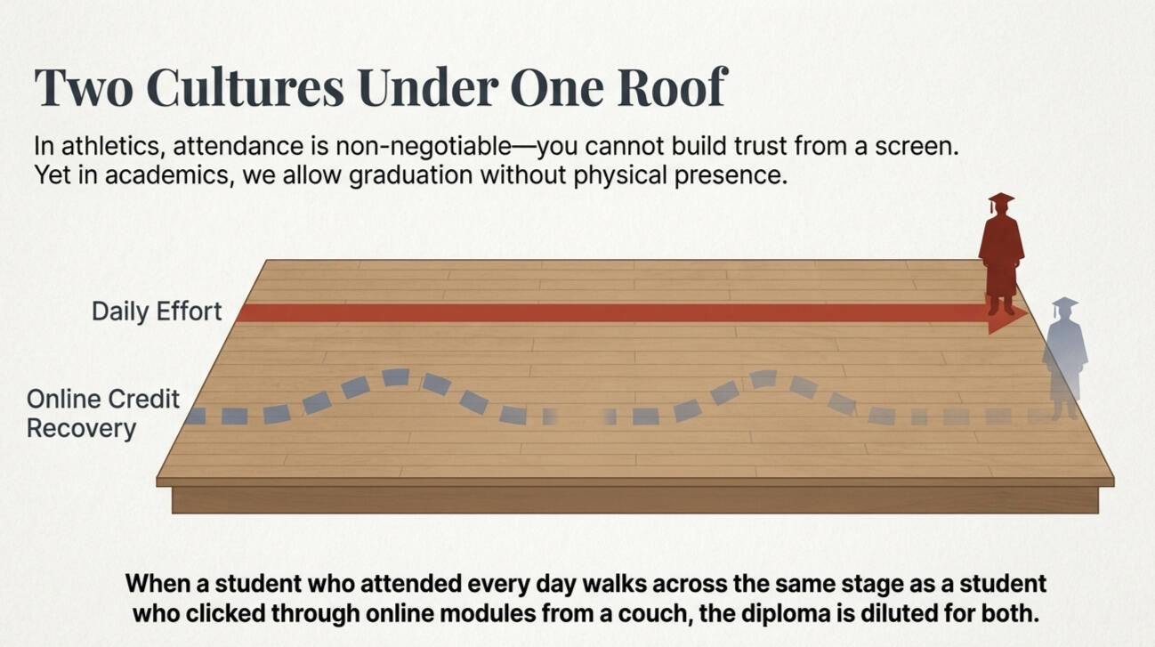 Chapter 4: "If You Build It, They Will Come"Attendance Is StructuralIn athletics, nobody debates whether showing up matters. This chapter argues the classroom deserves the same structural logic and names the two cultures forming inside schools that can no longer coexist under the same roof.