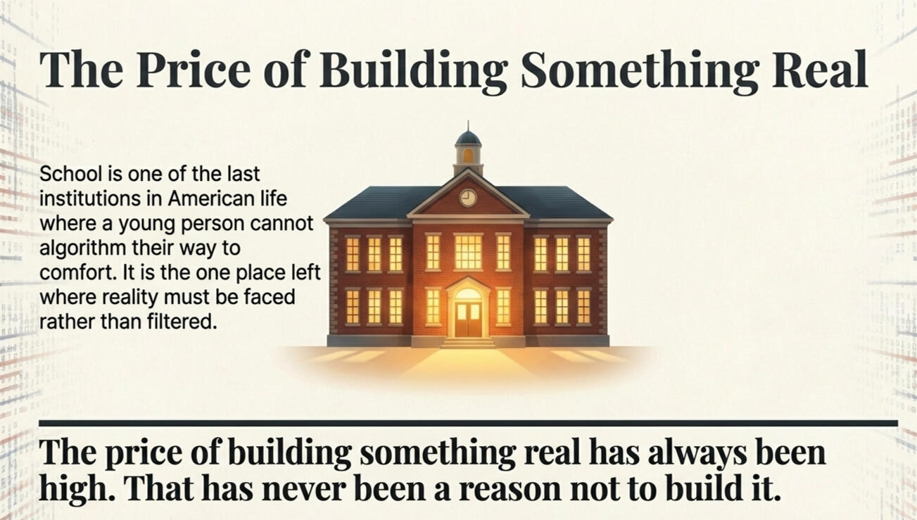 A Word to the People in the BuildingIf you are a teacher reading this, I need to say something directly. It is not your fault.The conditions you are working in were not created by you. The behaviors you are managing were not caused by you. You did not decide to let students carry phones all day. You did not design online credit recovery systems that allow students to earn diplomas without showing up. You did not adopt AI policies that are unclear, unenforceable, or nonexistent. You did not lower attendance standards. Those were structural decisions made by people with the authority to set policy. And when those decisions created exactly the dysfunction anyone with common sense could have predicted, the response was not to fix the policy. It was to send you to another training on how to cope with the consequences.Every training day carries the same unspoken message: if you were better at de-escalation, the behaviors would improve. If you were more resilient, the burnout would decrease. If you were more engaging, the students would pay attention. The finger always points downhill. It points at the people with the least power and the most exposure.This book does not point downhill. This book names the structural failures that created the conditions and argues for fixing them. The problems in your classroom trace back to decisions that were made above you. And the solutions require decisions that must be made above you. What you deserve is leadership that makes the hard calls instead of hiring another consultant to help you survive the consequences of their inaction.If you are an administrator reading this, I am not here to attack you. I am here to ask you to lead. The decisions this book calls for are not complicated. They are hard. There is a difference. Remove the phones. Enforce attendance. Set clear AI policies. Hold standards. These are simple sentences. Every one of them will cost you political capital, difficult conversations, and pushback from people who would rather keep things easy. That is the cost of leadership. It has always been the cost of leadership. And it is worth paying, because the alternative is a building that looks like a school but has stopped functioning as one.If you are a parent reading this, I am asking you to be part of the solution. The changes this book proposes will make your child's life harder in the short term and better in the long term. A school-wide phone ban during school hours means your child will not have access to their social world for seven hours. Attendance standards mean fewer workarounds when mornings are hard. AI policies mean your child will have to do the thinking themselves. Those are real costs. What they save you is a child who actually learned something. A diploma your family can be proud of because your child earned it through real investment.• • •A Framework for What Comes NextThe problems described in this introduction are not inevitable. They are the result of structural decisions, and structural decisions can be changed. What follows is a framework built on three principles that have been tested, not in theory, but in classrooms, on practice fields, and in communities where standards still mean something.Responsibility. Showing up physically matters, and we say so clearly. Attendance is not a guideline. It is a requirement. Students are expected to be present, not because we are rigid, but because presence is the precondition for everything school is designed to do.Real rewards and consequences. Standards must mean something. Diplomas must cost something. Grades must reflect something. When a student meets a high standard, that achievement is recognized and valued. When a student does not meet the standard, the answer is not to lower the bar. The answer is to help them reach the bar, without pretending they already have.Adults who neither rescue nor abandon. We do not make the bar easier to clear just because students have more ways to walk around it. And we do not give up on students who struggle to reach the bar. We hold the standard and we stay in the room. That combination, high expectations paired with persistent, present support, is the only formula that builds both competence and character.These are not new ideas. They are old ideas applied to a new problem. The simulation economy is new. The forces of AI, smartphones, and online recovery are new. But the human need for structure, effort, and the presence of adults who hold the line has not changed. It will not change.• • •The Last Building StandingIn a culture optimized for simulation, avoidance, and frictionless completion, a place that still requires you to show up, put the phone away, do the work, and be present with other human beings is not outdated. It is essential.School is one of the last institutions in American life where this is still possible. Where a young person cannot curate their experience, cannot algorithm their way to comfort, cannot outsource the difficulty to a machine. Where they must sit in a room with people they did not choose, face expectations they did not set, and do work that does not come easily. And where an adult is there to hold them to it.That is not a burden. That is a gift. It is the one place left where reality still has to be faced rather than filtered.But it will not survive on autopilot. If schools attempt to coexist structurally with the simulation economy, if they allow phones to remain, if they let AI replace effort, if they award diplomas without presence, if they lower standards to accommodate avoidance, they will dilute their purpose until there is nothing left worth protecting.If schools choose instead to remain structurally different, to be the place that still demands something real, they can preserve what makes them irreplaceable. And on the other side of that decision is something worth fighting for. A hallway where students look up from their phones and make eye contact. A classroom where the teacher has the ro
