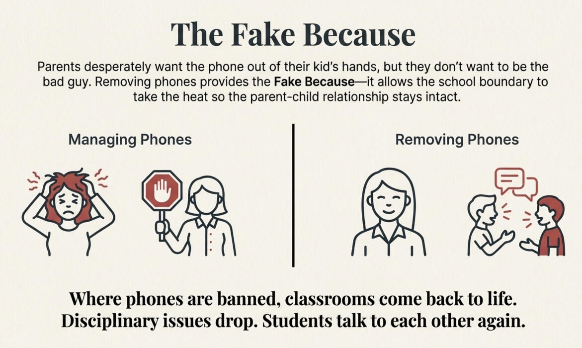 We Have Been Here BeforeIf you think removing phones from schools sounds extreme, consider two things that used to be completely normal on school campuses in America.In the 1970s and early 1980s, most high schools in this country had a smoking section. Students could smoke cigarettes on school grounds during designated times. Administrators allowed it because the thinking was simple: kids are going to smoke anyway, so we might as well give them a place to do it. It was not an endorsement. It was a surrender disguised as a reasonable accommodation.Try telling a parent today that your school has a smoking section for students. They would think you lost your mind. But fifty years ago, that was the accepted norm. Nobody questioned it. Schools provided ashtrays.I grew up in Southeast Texas. When I was in high school, my friends and I drove our pickup trucks to school with hunting rifles in the gun rack. Fully visible through the back window. Nobody thought twice about it. It was just part of the culture. Kids hunted. Kids drove trucks. The rifles came with them.When schools eventually banned firearms from campus, students pushed back. Parents pushed back. People said it was an overreaction. People said it was taking away a freedom. People said the kids were responsible enough to handle it.Sound familiar?Nobody today would argue that we should go back to rifles in the parking lot or cigarettes on the quad. The culture moved. The decision looks obvious in hindsight. At the time, it felt controversial. It felt like leadership was overreacting. And then it became the new normal, and everyone moved on.Phones are next. And here is the part that should concern every parent, every teacher, and every administrator more than the smoking section ever did.Cigarettes damaged health. Rifles posed a safety risk. Both were serious enough to justify removing them from schools. But neither one robbed students of their attention for seven hours a day. Neither one was engineered by billion-dollar companies to create dependency. Neither one followed a student into every classroom, every hallway, every lunch table, and every moment of the school day.The smartphone does all of that.What the biggest technology companies on earth have done to students is something we will look back on the way we look back on the smoking section. We will wonder how we ever allowed it. We will wonder why it took us so long to act. The deliberate engineering of addiction, the intentional capture of adolescent attention, the design of platforms that exploit the developing brain for profit, that is not a neutral technology choice. It is something far more sinister.And here is the final piece. You can quit smoking. Millions of people have. It is hard, but it is possible. The smartphone is different. You cannot quit the smartphone. It is woven into every part of modern life. That is exactly why schools must be the place where students get a break from it. Not because we are anti-technology. Because we are the last environment with the authority and the structure to say: not here, not during these hours, not while you are supposed to be learning.If we could figure out how to remove smoking sections and rifle racks from schools, we can figure out how to remove phones. The question was never whether we could do it. The question has always been whether we would.• • •What Happens When You Actually Remove ThemThe evidence on phone-free schools is no longer a debate. It is a pattern.France banned phones for students under fifteen during school hours in 2018. Schools reported fewer disciplinary issues, improved focus, and something that surprised educators: students started interacting with each other again during breaks. They had conversations. They played. They did the things teenagers are supposed to do when you take away the screen and leave them with each other.In the United States, districts using locking pouches or mandatory storage saw engagement increase and phone-related conflict drop. In one New York school, fights decreased and social media conflicts during school hours dropped significantly. In a California district, teachers described classrooms that felt alive again.A study across Spanish regions found that phone bans led to meaningful increases in math and science scores and a measurable reduction in bullying, especially among younger students. Researchers estimated that phone distractions across developed countries cost students close to a year of learning in math alone. That is not a minor inconvenience. That is a structural tax on every student in the building.The pattern is consistent. Remove the phones and the room comes back to life.And the support is already there. Recent surveys show that roughly 76 percent of teenagers and 93 percent of parents support some form of school phone restriction. The resistance is louder than it is large. Most families already believe this is the right thing to do. They are waiting for someone to make the decision.And many of them are waiting for a reason that has nothing to do with research.• • •The Fake BecauseThere is a concept in persuasion that Scott Adams writes about in his book How to Fail at Almost Everything and Still Win Big. He calls it the fake because.The idea is simple. People are more willing to accept a decision when they are given a reason for it, even if the reason is not the real reason. The word “because” is powerful. It gives people something to point to. It makes a hard conversation easier. It provides cover.This matters for the phone conversation more than most people realize.Here is what I know from talking to parents, not just in my school but in communities everywhere. Most parents want the phone out of their kid’s hands during school. They see the distraction. They see their child glued to a screen at the dinner table and they can imagine what it looks like in a classroom. They know, on some level, that the phone is not helping.But they cannot be the 