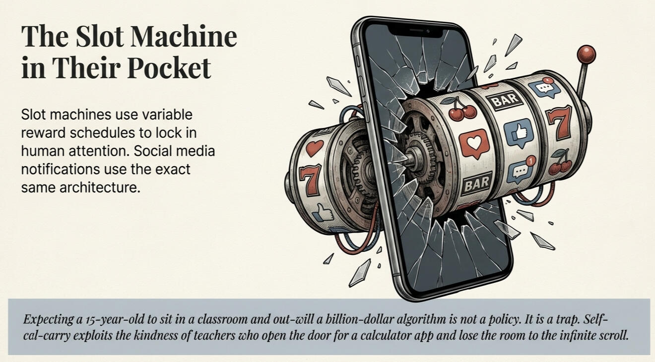 The Slot Machine in Their PocketBefore I became a teacher, I spent more than two decades in the casino industry. I opened the first casino in Black Hawk, Colorado, when I was twenty-six years old. I trained hundreds of employees and operated in one of the most tightly regulated industries in the country.Running a casino teaches you something most people never think about. It teaches you how human attention works.Casinos are not built around luck. They are built around psychology. Every light, every sound, every reward schedule inside a casino is carefully engineered to hold a person’s attention just a little longer. Slot machines do not simply pay out randomly. They use what behavioral psychologists call variable reward schedules. Sometimes the machine pays quickly. Sometimes it waits. Sometimes it almost pays. That unpredictability keeps the brain engaged because the next reward might be just one pull away.If the reward came every single time, the brain would lose interest. If the reward never came, the brain would give up. The magic zone is uncertainty. That is where attention locks in.The device sitting in a student’s pocket runs on the exact same architecture. Every notification, every vibration, every refresh of a social media feed is a tiny pull of the lever. Sometimes there is nothing there. Sometimes there is a message. Sometimes there is a like, a comment, a video, or a piece of drama happening somewhere in their social world. The reward is unpredictable. Which means the brain keeps checking.The average adult checks their phone close to a hundred times a day. That is roughly once every ten minutes during waking hours. And that is adults with fully developed impulse control.Now imagine asking a fifteen-year-old to sit in a classroom with that machine in their pocket and simply ignore it.That is what schools across the country are doing every day. We call it self-carry.• • •What Self-Carry Actually Looks LikeSelf-carry sounds reasonable. Students keep their phones on their person but are not allowed to use them during class. Keep it in your pocket. Pay attention. If a teacher sees it, you will be asked to put it away.On paper, this works. In practice, it does not.I work in a school where the phone policy is clear. No phone use during classroom periods. The rule is posted, explained, and enforced. The students know it. Most of them are compliant. These are good kids in a good school with a reasonable policy.And it still does not work.Here is what I have found. When I ask teachers how the phone policy is going in their classroom, the answer is almost always the same. “Great. My kids don’t really use their phones.” And I know, because I have watched it happen over and over, that they are kidding themselves.It is not that they are bad teachers. It is the opposite. They are good teachers being reasonable. They are being the kind of caring, helpful adults that students need in a room. And that is exactly what the phone exploits.A student needs to text a parent. Of course you let them. A student says they need the calculator app. Of course. A group of students is organizing for a basketball game they are leaving for next period. Sure, go ahead. A student says they are checking an assignment. Makes sense. A student is looking something up for the lesson. Why would you say no?Each one of those moments seems small. Each one seems reasonable. And each one opens the door just enough for the device to do what it was designed to do. Because the phone does not stay on the calculator. It does not stay on the text to the parent. It drifts. It always drifts. One check becomes two. One minute becomes five. And the teacher, who was being a reasonable and loving adult, has just lost a piece of the room without even realizing it.This is what the technology companies are counting on. They know teachers are not tyrants. They know teachers want to be helpful. They know that a caring adult in a room full of teenagers will always lean toward saying yes. And they have designed their products to take advantage of that instinct. Every exception, every reasonable accommodation, every moment a teacher opens the door just a crack, the phone walks through it.That is not a failure of teaching. That is a system designed to exploit the best instincts of the people in the room. It is calculated. It is deliberate. And it is sinister.• • •The Industry That Needs the Phone to StayAnd the companies behind these devices are not sitting quietly while schools consider removing them.This is important to understand. The technology companies that design phones, apps, and social media platforms have a financial interest in keeping those devices in the hands of students for as many hours of the day as possible. Every hour a student spends on a phone is an hour of data collection, ad revenue, and engagement metrics. A school day is seven hours. Multiply that by millions of students across the country, and you are looking at one of the largest captive audiences in the world.They do not want schools to ban phones during the school day. They see it coming. They see the research mounting. They see countries like France acting. They see districts across the United States starting to move. And they are doing what every industry does when its product is threatened. They are pushing back.The counterarguments you will hear later in this chapter, that phones are learning tools, that students need them for safety, that banning phones is anti-technology, those arguments did not come from teachers. They did not come from parents sitting at kitchen tables worried about their kids. They came from an industry that needs the phone to stay in the student’s hand in order to keep the revenue flowing.This is the same pattern I described in the Coach’s Note at the beginning of this book. When a school hires a consultant to address behavior problems caused by structural failures, the consultant has no incentive to identify the 
